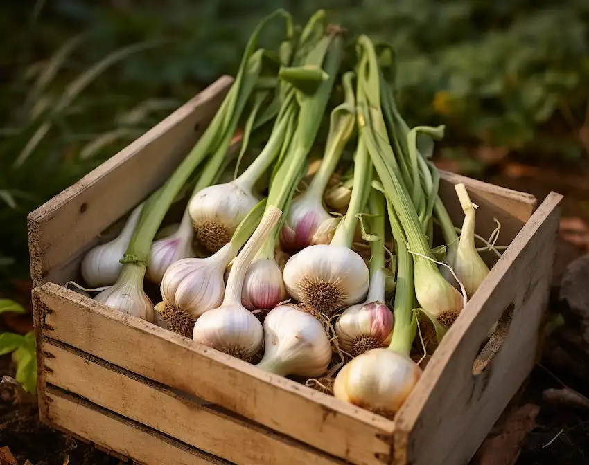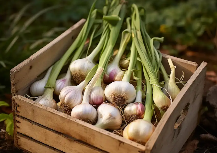 Harvesting : The best time to harvest garlic is when the lower leaves begin to turn brown but the upper leaves remain green. Carefully dig up the bulbs with a spade or garden fork.
